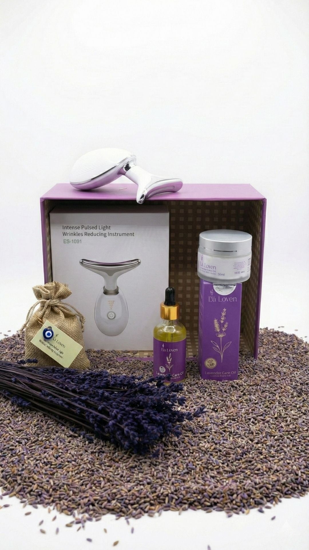 Laloven'in bu seti, cildiniz için teknolojiyi ve doğayı bir araya getiriyor. Setin yıldızı olan masaj aleti, Lavanta Bakım Yağı ile birleştiğinde, cildinizin sıkılaşmasına, canlanmasına ve doğal ışıltısını geri kazanmasına yardımcı olur. Aynı zamanda Lavanta Kese Kokusu ile banyo veya yatak odanızda huzurlu bir atmosfer sağlar.