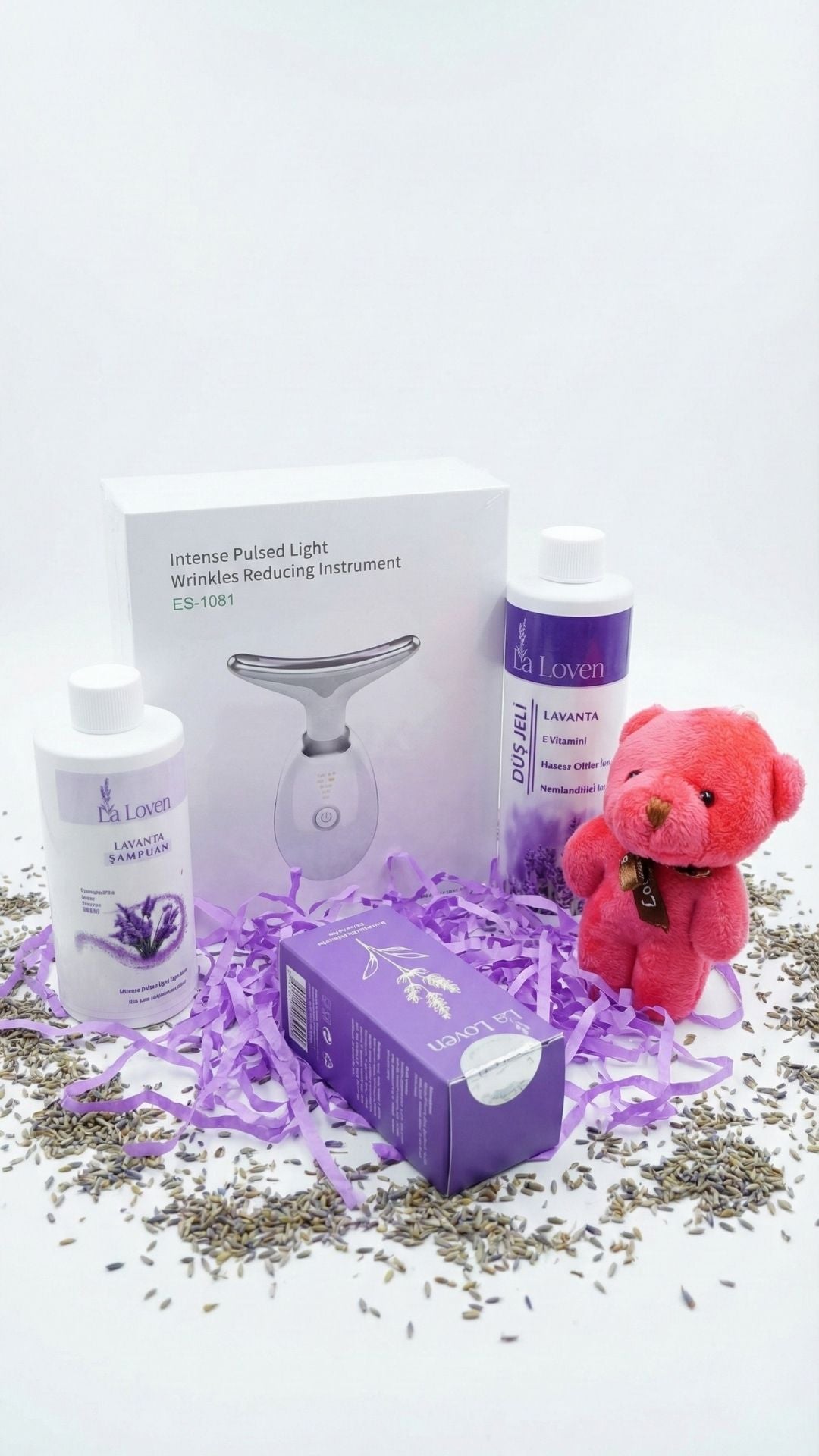 Lavanta Bakım ve Rahatlama Seti – Yüz Masaj Aleti, Lavanta Şampuan, Duş Jeli, Peluş Oyuncak & Lavanta Bakım Yağı