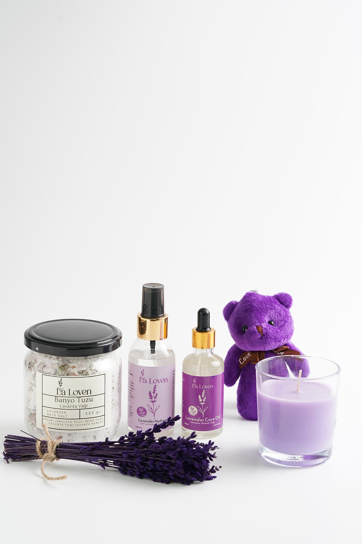 LaLoven Mini Hediye Seti – Banyo Tuzu, Hidrosol, Bakım Yağı, Mum, Lavanta Demeti ve Peluş Ayıcık