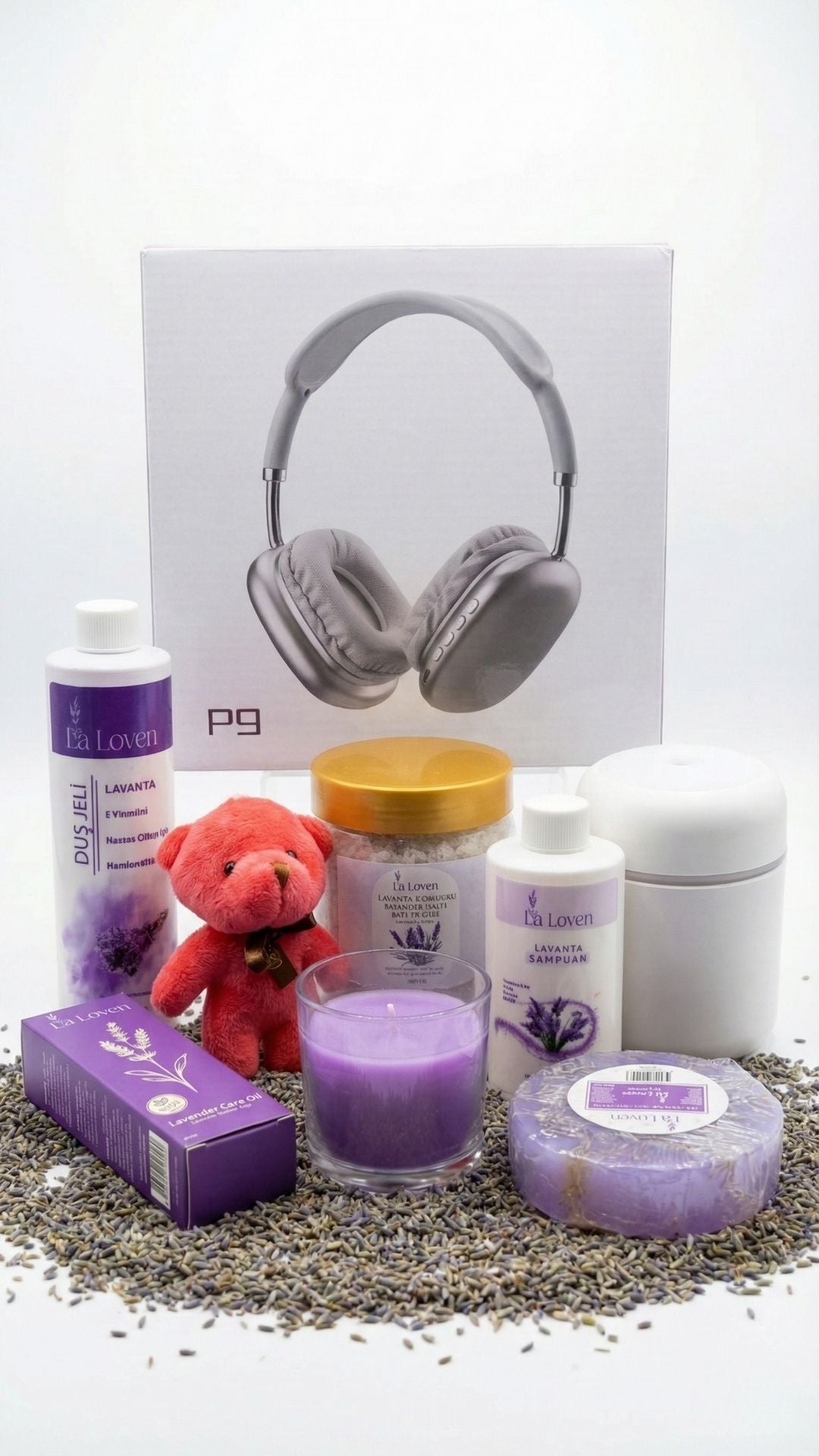 Lavanta Relax Hediye Seti – Bluetooth Kulaklık, Duş Jeli, Lavanta Bakım Yağı, Banyo Tuzu, Şampuan, Difüzör, Peluş Ayıcık, Kavanoz Mum, Lavanta Sabun