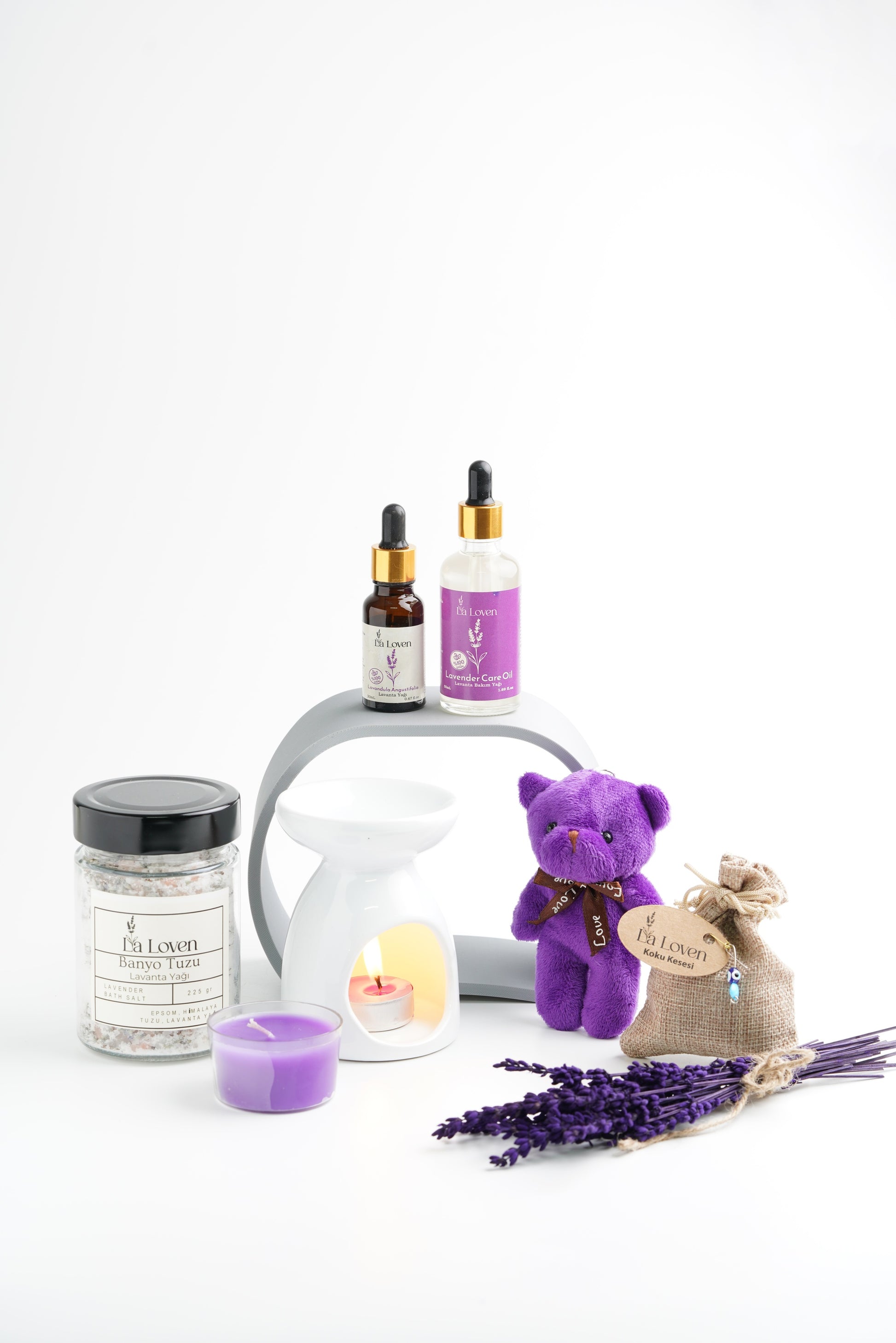 LaLoven Zengin Aromaterapi Seti– Buhurdanlık, Lavanta Yağları, Banyo Tuzu, Koku Kesesi, Mum, Lavanta Demeti ve Peluş Ayıcık
